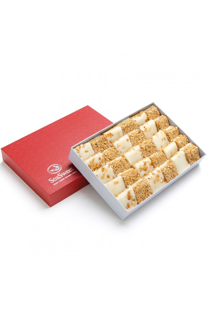 A gift box weighing around 950g of Coconut Sesame. Ingredients: Coconut, white chocolate, Condensed milk, sesame, glucose, sugar