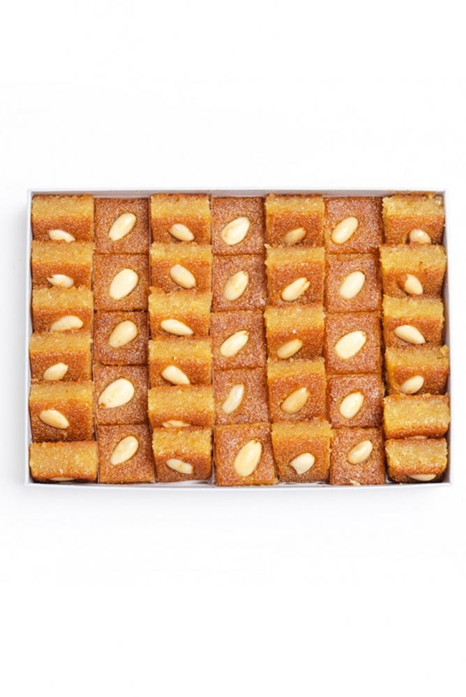 A gift box weighing around 900g of Nammoura. Ingredients: Sugar syrup, semolina, sugar, milk, coconut, animal ghee, tahina, almond, yeast, starch, sodium bicarbonate