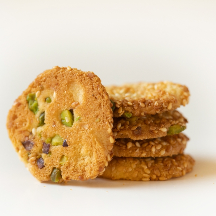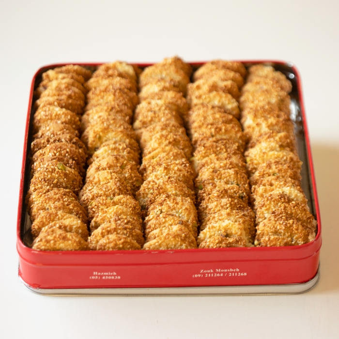 A tin box weighing around 950g of Baraze. Ingredients: Wheat flour paste, with butter ghee, eggs, baking powder, vanilla covered with sesame seeds